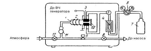 1 - розрядна камера; 2 - індуктор; 3 - обкладки конденсатора; 4 - ротаметр; 5- натікач; 6 - редуктор; 7 - джерело газу; 8 - клапан; 9 - вакуумний датчик; 10 - кришка; 11- вакуум-провід; 12- випускаючий клапан.