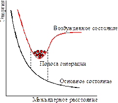 Процесс получения генерации в эксимерном лазере удобно рассмотреть с помощью рисунка 2, на котором представлены кривые потенциальной энергии для основного и возбужденного состояний двухатомной молекулы А2 .
