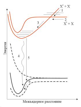 При высоком давлении газа в рабочем объеме быстрая электронная и колебательная релаксация приводит к заселению наинизших уровней ионных термов. Чтобы эти процессы оказались эффективными, молекула не должна иметь отталкивательных потенциальных кривых, соответствующих атомам в основных состояниях и пересекающих потенциальные кривые связанных верхних состояний. Дезактивация верхних уровней происходит за счет излучения (процесс 4) и тушения (процесс 5), первый из которых является желательным, а второй - нежелательным процессом. Из спектроскопических измерений следует, что излучательные процессы заканчиваются на высоких колебательных уровнях нижней потенциальной кривой, которая не представляет собой основное состояние. Последующие столкновения в газе способствуют быстрой колебательной релаксации или даже диссоциации нижнего уровня, поддерживая таким образом инверсию населенностей. К заселению верхнего лазерного уровня могут приводить несколько различных процессов. Нижний уровень не обязательно является самым низким энергетическим состоянием молекулы.