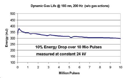 Излучение лазера обладает высокой стабильностью энергии от импульса к импульсу (0,77% для KrF).