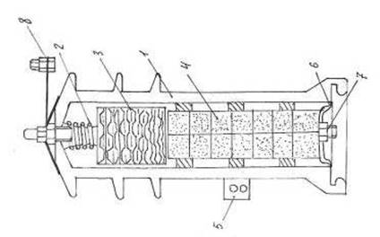 Вентильный разрядник РВП состоит из рабочего сопротивления набранного из вилитовых (тиритовых) дисков, основной частью которых является карбид кремния, и искровых промежутков, выполненных из латунных электродов, разделенных слюдяными, миканитовыми или фарфоровыми прокладками. Сжатие прокладок осуществляет пружина. Все устройство помещено в фарфоровый корпус, герметизированный озоностойкой резиной. Для крепления разрядника служит хомут с двумя отверстиями под болты. Разрядник присоединяют к токоведущему проводу пластиной, а к земле с помощью шпильки. При номинальном напряжении в линии сопротивление вилита очень велико, и ток через разрядник не проходит. При грозовом разряде напряжение достигает огромных значений, сопротивление вилита падает и волна грозового перенапряжения проходит в землю. После спада перенапряжения сопротивление велита снова восстанавливается.