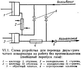 На рис. VI.1 представлена схема устройства для перевода двухступенчатого компрессора на работу без противодавления. При поступлении сигнала, вызывающего открывание перепускных клапанов, газ, сжатый I и II ступенями компрессора, свободно направляется на сторону всасывания. Обратный клапан препятствует утечке сжатого газа из системы, обслуживаемой компрессором. Потери энергии при изменении производительности компрессора переводом на работу без противодавления значительно ниже, чем при байпасировании.