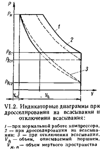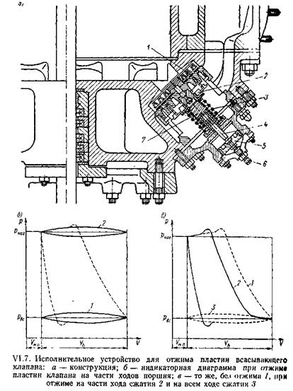 На рис. VI.7, в изображена индикаторная диаграмма компрессора при изменении производительности отжимом всасывающих клапанов па части хода сжатия.