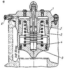 На рис. VI.1, а показан вариант конструкции исполнительного устройства со специальным клапаном. Перепускное отверстие перекрывается клапаном 1, который движется по направляющему поршню 4, жестко соединенному посредством штока 5 с крышкой 1. Пружина 1 и давление газа в цилиндре при ходе сжатия стремятся открыть проходное сечение клапана. При работе в режиме номинальной производительности эти усилии преодолеваются подводимым через штуцер 6 сжатым воздухом под давлением 0,5-0,8МП a (5-8кГ/см1 ) от ресивера. Развиваемое при этом усилие обеспечивает надежное запирание клапаном 1 отверстия в седле клапана. При необходимости разгрузить ступень компрессора линия, подводящая сжатый воздух штуцер 6, отключается от ресивера и соединяется с атмосферой. Усилием сжимаемого в цилиндре компрессора газа и пружины 1 клапан поднимается и открывает проходное сечение в седле. Особенностью конструкции является наличие направляющего поршня, благодаря чему значительно ищется усилие, необходимое для закрытия перепускного клапана, и соответственно - размеры узлов устройства. Однако при этом несколько увеличивается объем мертвого пространства, и для надежного запирания клапана необходимо тщательно устанавливать устройство и притирать клапан к седлу.