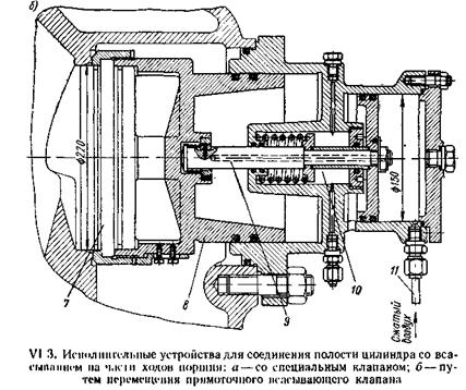 На рис. VI.1, б представлен вариант конструкции исполнительного устройства с применением в качестве выпускного клапана одного из прямоточных всасывающих клапанов компрессора. Сжатый воздух (или газ), подаваемый через штуцер 11, воздействует на двухпоршневой привод, который полый шток 9 с помощью направляющего поршня 8 обеспечивает посадку прямоточного всасывающего клапана 7 на седло в цилиндре компрессора. При срабатывании давления путем соединения штуцера 11 с атмосферой клапан под воздействием давлений в цилиндре и в полости всасывания и возвратной пружины перемещается вправо и открывает отверстие, соединяющее цилиндр компрессора с полостью всасывания. Демпфер 10, заполненный маслом, обеспечивает плавную посадку клапана в седло. Имеются также ряд типов исполнительных устройств, обеспечивающих соединение полости цилиндра со стороной всасывания на части хода сжатия.