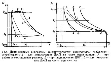 На рис. VI.4, а показан характер изменения индикаторной диаграммы одноступенчатого компрессора после подключения ДМП. При описываемом способе изменения производительности работа, затрачиваемая на сжатие газа в объеме мертвого пространства, при его расширении возвращается на вал компрессора. Потери во всасывающем и нагнетательном клапанах несколько снизятся, поскольку количество протекающего через них газа уменьшится и, следовательно, величина относительной потери давления станет меньше.
