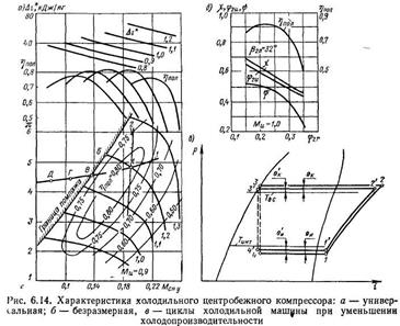 (Рис.6.14, б) и представляют собой экспериментальную основу при проектировании. Энергетические показатели центробежного компрессора в эксплуатации определяются как его характеристикой, так и сетью, на которую она работает. Для компрессора паровой холодильной машины, например, сетью является система теплообменных аппаратов: испаритель, конденсатор и соединительные трубопроводы. Допустим, что при расчетном режиме совместная работа компрессора и сети определяется точкой А. Рассмотрим изменение режима работы, при котором холодопроизводительность уменьшается, а средние температуры источников остался неизменными (Рис.6.14, в). Перепады температур