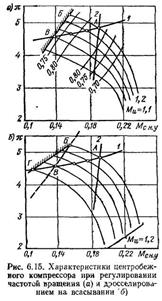 (Рис.6.14, а). Индивидуальные характеристики получают при испытаниях компрессора на специальных стендах, изменяя производительность дросселированием на нагнетании с помощью специальной заслонки или вентиля. При максимальной производительности из-за больших потерь в проточной части значения отношений давлений и КПД невелики. С уменьшением производительности потери в проточной части снижаются. При этом