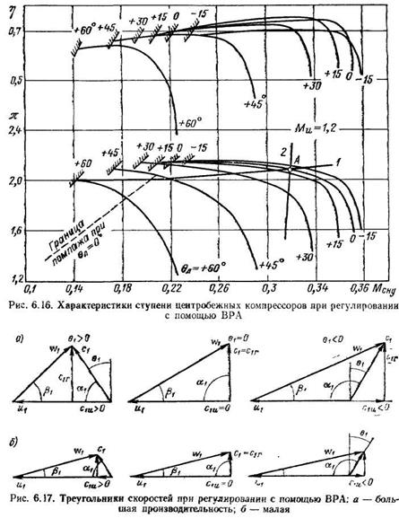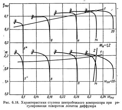 КПД в точке совместной работы ступени и сети будет ниже максимального. Из сопоставления характеристик, приведенных на Рис.6.16 и 6.18, видно, что вследствие этого КПД ступени с БЛД, регулируемой поворотом лопаток ВРА, и той же ступени, регулируемой поворотом лопаток диффузора, при работе на сеть с характеристикой 1 будет примерно одинаковым, несмотря на то, что максимальные КПД у ступени с ЛД на 1-4% выше, чем у ступени с БЛД. Это показывает, что сравнение эффективности различных способов регулирования производительности возможно только при совместном рассмотрении характеристик компрессора и сети, на которую он работает.