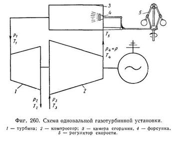 Простейшая схема одновальной газовой турбины постоянного горения изображена на фиг.160. Воздух при температуре Т1 и давлении р1 поступает в компрессор 1, в котором он сжимается до некоторого давления р4 , и температура его при этом возрастает до T4 . Из компрессора воздух поступает в камеру сгорания 1, где его температура повышается за счет сжигания топлива, поступающего через форсунку 4. Продукты сгорания при достаточно высоком давлении и при высокой температуре подводятся к турбине 1, в которой совершается расширение газа до давления р1 и температуры T1 . В лопаточном аппарате турбины потенциальная энергия газа преобразуется в кинетическую энергию, которая частично используется в виде механической работы, совершаемой посредством рабочих колес и вала.