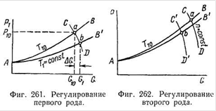 Регулирование первого рода осуществляется путем изменения температуры газа перед турбиной Т1 . Это средство является наиболее, простым и вместе с тем достаточно сильным для того, чтобы ГТУ могла работать на любом предусмотренном режиме. Вместе с изменением температуры меняются также давление и расход газа G турбиной. Поэтому на универсальной диаграмме (фиг.161) в зависимости от температуры Т1 меняется также характеристика турбины АВ. Изменение давления газа перед турбиной сказывается и на изменении количества воздуха AG, подаваемого компрессором.
