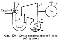 Простейшая схема конденсационного турбогенератора изображена на фиг.100. Турбина 1 приводит во вращение электрический генератор 1. Пар в турбину поступает через клапан 1. Между клапаном и лопаточным аппаратом турбины расположен паровой объем 5. Значительные паровые объемы могут также находиться между отдельными частями лопаточного аппарата турбины (в двухцилиндровых турбинах и особенно при наличии промежуточного перегрева). Пар из турбины поступает в конденсатор 4.