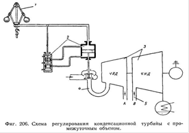 Современные крупные турбины для высоких параметров пара выполняются с промежуточным его перегревом (фиг.106). Камеры и трубы А и В , по которым пар подводится к перегревателю и отводится из него, образуют значительный аккумулятор тепла, и последний оказывает сильное влияние на процесс регулирования.