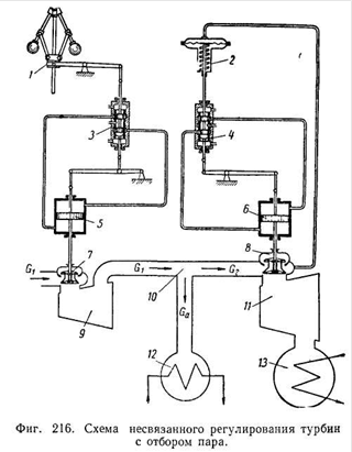При отсутствии указанных кинематических связей каждый регулятор управляет только одной группой клапанов: регулятор скорости - клапанами части высокого давления, а регулятор давления - клапанами части низкого давления. Такое регулирование называется несвязанным (фиг.116).