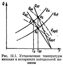 Установление температуры в охлаждаемом помещении. Температура охлаждаемого объекта зависит от температуры кипения рабочего вещества, которая самоустанавливается в зависимости от производительности компрессора, испарителя и конденсатора. На рис.11.1 показана зависимость холодопроизводительности компрессора QK и испарителя Q0 от температуры кипения при постоянной температуре конденсации. Пересечение линий Q0 и Q0 l определяет рабочую точку А . Перпендикуляр, опущенный из точки А на ось абсцисс, дает значение температуры кипения Т0 . При этом линия, характеризующая расходную характеристику дроссельного вентиля Qдр , должна проходить через точку А. Если изменится зависимость компрессора Qк= f (Т0 ) и станет QK 1 = f1 ( T0 ) ( рис 11.1) при неизменной характеристике испарителя Q0 - f ( T0 ), то рабочая точка переместится в точку А1 и температура кипения примет новое значение Т01 . Расходную характеристику дроссельного вентиля необходимо изменить таким образом, чтобы она проходила через точку A1 Здесь следует подчеркнуть пассивную роль дроссельного вентиля. Температура кипения устанавливается не в результате степени открытия дроссельного вентиля, а в результате изменения холодопроизводительности компрессора. Степень открытия дроссельного вентиля должна соответствовать рабочей точке холодильной машины. В противном случае машина будет работать в неустановившемся режиме.