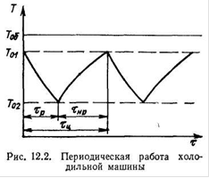 Рассмотрим двухпозиционное регулирование. При периодической работе холодильной машины (рис.11.1) температура кипения Т0 понижается от Т01 до Т01 . Компрессор останавливается, когда температура кипения достигает значения Т01 , но теплоприток к испарителю продолжается. После того как температура рабочего вещества в испарителе снова достигает значения Т01 , компрессор включается и период повторяется. Таким образом, каждый период τц состоит из двух частей: первой части, в которой компрессор включен (τр ), и второй части, в продолжение которой компрессор не работает (τнр ).