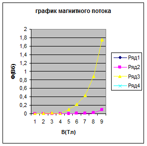 Задаваясь различным значением магнитной индукции вычислим значения магнитного потока. Данные занесем в таблицу№1. и посторонним график зависимости магнитного потока от магнитной индукции.