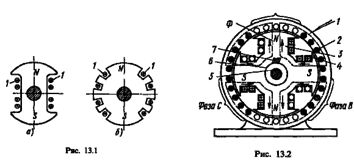 На рис.13.2 показана конструктивная схема явнополюсной трехфазной синхронной машины, состоящей из статора 1, трехфазной обмотки статора 2, явнополюсного ротора 3, обмотки ротора 4, вала ротора 5, контактных колец б, щеток 7. Следует отметить, что обмотки статора и ротора имеют одинаковое число полюсов.