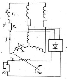 Постоянный ток обмотки возбуждения ротора создает основное магнитное поле машины. Магнитные линии потоков каждого полюса образуют замкнутые контуры. Распределение магнитной индукции в зазоре между полюсом ротора и статора синусоидально. Регулирование током возбуждения Iв можно осуществлять с помощью реостата Rр . При вращении ротора поток Фо вращается вместе с ним и пересекает обмотки статора. При этом в обмотках статора индуцируется трехфазная система ЭДС.