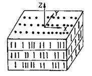 Для смектичного типу структури функція L = const , а ρ періодична вздовж осі, наприклад OZ, і стала у площиніXOY (рис. 4). Цей тип структури характеризується двовимірною впорядкованістю молекул при паралелізації їх та ранжуванні центра мас молекул. Смектичні рідкі кристали мають шарувату структуру. Можливі різні типи упаковок молекул у шарах, внаслідок чого смектичні рідкі кристали мають велику кількість модифікацій.