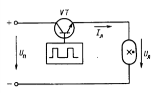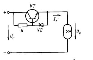 В полупроводниковых ПРА (вторая группа) стабилизация тока лампы осуществляется с помощью полупроводниковых приборов, обычно транзисторов. На рис. 4 приведена схема полупроводникового ПРА, в котором транзистор используется в качестве нелинейного сопротивления. Схема удовлетворительно работает на постоянном токе при незначительных колебаниях напряжения источника питания. На переменном токе схемы нелинейных полупроводниковых ПРА обладают большими собственными потерями.