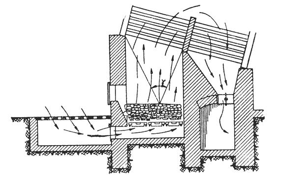 Воздух, требуемый для горения, нагнетается в топку вентиляторами. При наличии воздухоподогревателя дутьевой вентилятор располагают таким образом, чтобы нагнетаемый им воздух сначала проходил через воздухоподогреватель и затем, нагретый попадал в топку. Горение топлива происходит на решётке и в топочном пространстве, в результате чего образуются горячие газы. Газы под воздействием дымовой трубы и дымососа проходят по газоходам парового котла, пароперегревателя, экономайзера и воздухоподогревателя. Охлаждённые газы, предварительно пройдя через золоуловитель, удаляются в дымовую трубу. Шлак удаляется непосредственно из топки.