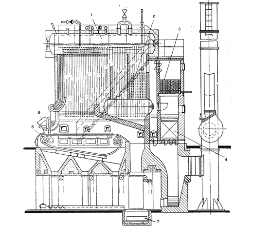 1-паровой котёл; 2-пароперегреватель; 3-экономайзер; 4-воздухоперегреватель; 5-топка (цепная решётка); 6-поступление топлива; 7-механическое шлакозолоудаление
