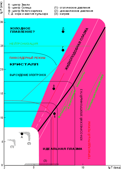 Чем тяжелее ядро элемента, чем больше его заряд, тем сильнее смещаются линии раздела фаз к оси температур. Поэтому точка, отвечающая условиям, к примеру, в коре пульсара (состоящей из железа), оказывается высоко над границей "кристалл - жидкоподобная плазма": кора пульсара твердая. Напротив, мантия пульсара, состоящая из нейтронов, протонов и элекронов, жидкая.