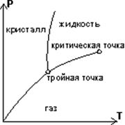 Рис. 3. Фазовая диаграмма для области относительно малых давлений и температур. При условиях, соответствующих точкам пограничных линий, фазы находятся в равновесии; при условиях, соответствующих тройной точке, система состоит из твердой, жидкой и газообразной фазы одновременно. В критической точке жидкость и пар становятся тождественными по своим физическим свойствам; за этой точкой эти две фазы неразличимы.