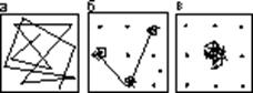 Рис. 4. Схематическое изображение траекторий движения частиц в газе (а), жидкости (б) и кристалле (в), при условии, что положения частиц во всех фазах фиксируются через равные промежутки времени. На двух последних рисунках точками обозначены атомы-соседи.