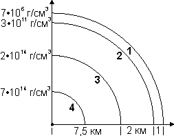 Рис. 6. Модель внутреннего строения пульсара средней массы. 1 - наружная кора (ядра и электроны); 2 - внутренняя кора (ядра, электроны и нейтроны); 3 - мантия (нейтроны, протоны и электроны); 4 - ядро пульсара (нейтроны, протоны, электроны, мезоны, резонансы, гипероны)