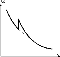 Рис. 7. Угловая скорость пульсара медленно убывает со временем. В момент звездотрясения она возрастает скачком в силу того, что резко меняется момент инерции звезды, но за время порядка недели график возвращается на прежний "путь"