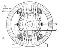 Рассмотрим подробнее схему устройства машины постоянного тока. На рис. 2 показана магнитная система двухполюсной машины и картина поля в ней. Основные полюсы укреплены на внутренней поверхности полого стального цилиндра — станины, являющейся частью магнитопровода. На полюсах находятся катушки-, соединенные последовательно и образующие обмотку возбуждения. Магнитное поле создается током возбуждения I в в катушках (реже постоянными магнитами). Цепь возбуждения — это вспомогательная цепь машины. Картина магнитного поля изображена на рис. 2 магнитными линиями.