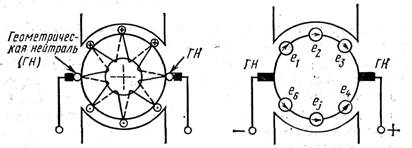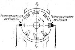Если установить неподвижные электрографитовые щетки для осуществления скользящего контакту с проводниками, проходящими геометрические нейтрали (см. рис. 3), то между щетками всегда будут находиться проводники обмотки с одинаково направленными э. д. с. е, сумма которых максимальна и постоянна (при сдвиге щеток эта сумма уменьшается).