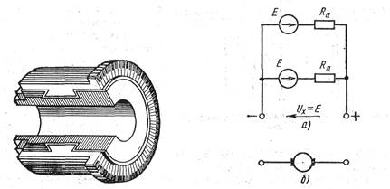 В результате установки щеток и соединения их с внешней цепью обмотка якоря по отношению к его зажимам оказывается разделенной на параллельно соединенные ветви с одинаковыми э. д. с. Е и сопротивлениями R а . Из схематически изображенной на рис. 6, а обмотки якоря видно, что э. д. с. якоря Е равна э. д. с. любой из параллельно соединенных ветвей. Внутреннее сопротивление якоря R я — это эквивалентное сопротивление параллельно соединенных ветвей обмотки. Обычно оно мало (от долей ома у крупных машин до единиц ом у небольших). Если к зажимам якоря генератора присоединить внешнюю электрическую цепь, то э. д. с. якоря создаст в цепи ток якоря (ток нагрузки, рабочий ток). В двигателе ток создается внешним источником и в якоре делится на токи параллельных ветвей. Направление тока во всех проводниках одной параллельной ветви одинаковое, противоположное направлению токов в другой ветви.