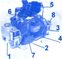 4 - ексцентриковий регулятор; 5 - важіль; 6 - клямка механізму; 7 - кнопка ручного повернення; 8 - рухомий мостиковий контакт; 9 - нерухомий контакт