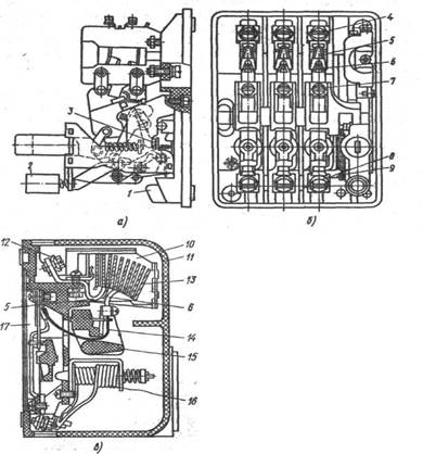 Автоматичний вимикач АП-50 (Рис.2.1., а-в). Повне розбирання вимикача необхідне, коли пошкоджені контакти і потрібна їх заміна. У більшості випадків, коли треба усунути дефекти різьблення контактів, дугогасильної гратки, очистити кіптяву на внутрішній поверхні і деталях вимикача або замінити зворотну пружину, досить обмежитися частковим розбиранням. Для цього вивертають гвинти кріплення кришки до основи 1 і кришку знімають. Знімають дугогасильну камеру, розчіпляють важіль 3 (якщо вимикач зведений), натиснувши для цього на кнопку «стоп» 2 або рейку траверси вивідних проводів. Для подальшого розбирання вивертають гвинти 7 і знімають нерухомі 5 і рухомі 6 контакти. При обриві або ослабленні за допомогою плоскогубців знімають поворотну пружину 9 содержателя.