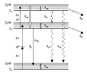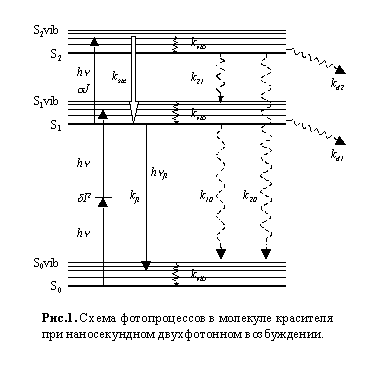 | Схема фотопроцессов в молекуле красителя при наносекундом двухфотонном возбуждении |