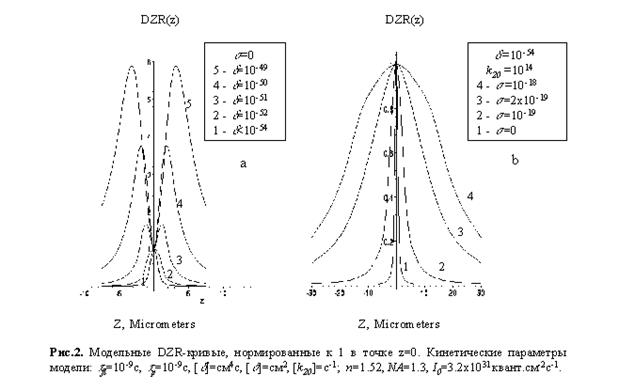 В качестве меры аксиального разрешения флуоресцентного микроскопа использовалась полуширина кривой дифференциального z-отклика (DZR - зависимость интенсивности флуоресценции из тонкого поперечного (по отношению к оптической оси) слоя исследуемого образца от расстояния между этим слоем и геометрическим фокусом объектива конфокального флуоресцентного микроскопа). Результаты модельных расчетов кривых дифференциального z-отклика приведены на pис.2.