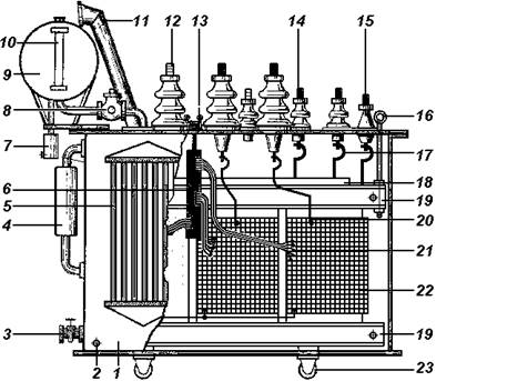 1 – бак; 2 – затискач заземлення; 3 – вентиль; 4 – термосифонний фільтр; 5 – радіатор; 6 – перемикач; 7 – повітроосушник; 8 – газове реле; 9 – розширник; 10 – масловказівник; 11 – викидна труба; 12 – вивід ВН; 13 – привід перемикаючого пристрою; 14 – вивід НН; 15 – нульовий вивід; 16 – кільце для підйому; 17 – відвід НН; 18– кістяк; 19 – ярмова балка кістяка (верхня та нижня); 20 – відвід ВН; 21 – регулювальні відгалуження обмоток ВН; 22 – обмотка НН та ВН; 23 – коток візка