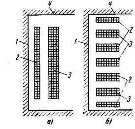 В залежності від призначення трансформатора, його типу, потужності і напруги обмотки виконуються різноманітних конструкцій. За взаємним розташуванням на стрижні обмотки поділяються на: концентричні, розташовані одна усередині іншої (рис. 2, а) та такі, що чергуються (рис. 2, б), у них частини обмоток ВН і НН насаджені поперемінно одна за іншою по висоті стрижня. Вертикальний канал уздовж внутрішньої поверхні гвинтової обмотки і канали між її витками утворюється рейками і прокладками.