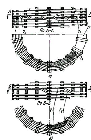 Намічається центр першої групової транспозиції, закріплюється останній намотаний виток обмотки затискачем і всі проводи розділяються на дві групи: з однаковим числом - при парній кількості проводів у витку, різним - при непарній (в одній із груп на один провід більше). Ці групи (рис. 4,б) міняються місцями після перекладці їх у двох полях, суміжних із центром транспозиції. В одному полі виконуються переходи проводів однієї групи, а через поле - іншої. Кожен провід верхньої групи вигинається окремо (за допомогою пристосування для гнуття при виконанні переходів), а потім всі проводи складаються стопкою, бандажуються тафтяною стрічкою в напівперекриття й укладаються з витком. Для запобігання замикання суміжних проводів першої й другої груп до і після виконання транспозиції між групами закладається смуга електрокартону і додатково на вигнуті частини витка установлюються відбортовані прокладки з електрокартону.
