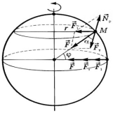 сообщает телу центростремительное ускорение. В точке Μ на географической широте φ сила тяжести направлена не по радиусу Земли, а под некоторым углом α к нему. Сила тяжести направлена по, так называемой, отвесной прямой (по вертикали вниз).