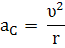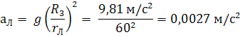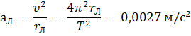 С таким ускорением, направленным к центру Земли, Луна движется по орбите. Следовательно, это ускорение является центростремительным ускорением. Его можно рассчитать по кинематической формуле для центростремительного ускорения: