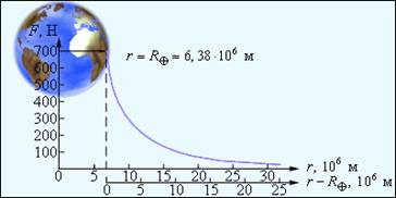 При удалении от поверхности Земли сила земного тяготения и ускорение свободного падения изменяются обратно пропорционально квадрату расстояния r до центра Земли. Рисунок иллюстрирует изменение силы тяготения, действующей на космонавта в космическом корабле при его удалении от Земли. Сила, с которой космонавт притягивается к Земле вблизи ее поверхности, принята равной 700 Н.
