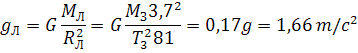 где T = 27,3 сут. – период обращения Луны вокруг Земли. Совпадение результатов расчетов, выполненных разными способами, подтверждает предположение Ньютона о единой природе силы, удерживающей Луну на орбите, и силы тяжести. Собственное гравитационное поле Луны определяет ускорение свободного падения gл на ее поверхности. Масса Луны в 81 раз меньше массы Земли, а ее радиус приблизительно в 3,7 раза меньше радиуса Земли. Поэтому ускорение gл определится выражением: