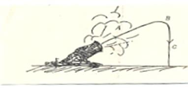Представления о траектории движения артиллерийских снарядов в те времена были довольно забавными. Считалось, что траектория эта состоит из трех участков: А - насильственного движения, В - смешанного движения и С - естественного движения, при котором ядро падает на солдат противника сверху.