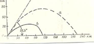 При заданной начальной скорости v0 наибольшая горизонтальная дальность в безвоздушном пространстве получается, когда sin 2 α = 1, т.е. при угле α=45°.