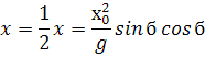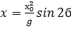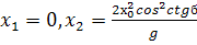 2. Горизонтальная дальность. Определим горизонтальную дальность, т.е. измеренное вдоль оси Оx расстояние ОС=Х. Полагая в равенстве (2) y=0, найдём точки пересечения траектории с осью Ох . Из уравнения: