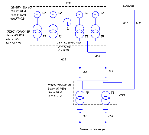 Выбор систем электроснабжения ДСП во многом определяется стремлением уменьшить влияние их резкопеременной нагрузки на качество электроэнергии. Одним из вариантов является подключение ДСП в точку с максимально возможной мощностью короткого замыкания. Другим вариантом является питание ДСП по схеме глубокого ввода с максимально возможным напряжением. К сожалению, в настоящее время отсутствует необходимое оборудование (печные трансформаторы и выключатели высокого напряжения с требуемыми коммутационной способностью и ресурсом работы) на напряжение 110 кВ и выше. Поэтому применяется напряжение 6, 10 и 35 кВ, что требует обычно дополнительной трансформации на ГПП, питаемых от линий 110 и 220 кВ. способом повышения мощности короткого замыкания является параллельная работа линий и трансформаторов, обеспечивающих надежное питание цехов с ДСП. Кроме того, для уменьшения влияния ДСП на работу других потребителей внутри завода применяются специальные схемы. Наиболее простым вариантом является питание ДСП и спокойной нагрузки от разных секций ГПП или различных трансформаторов.